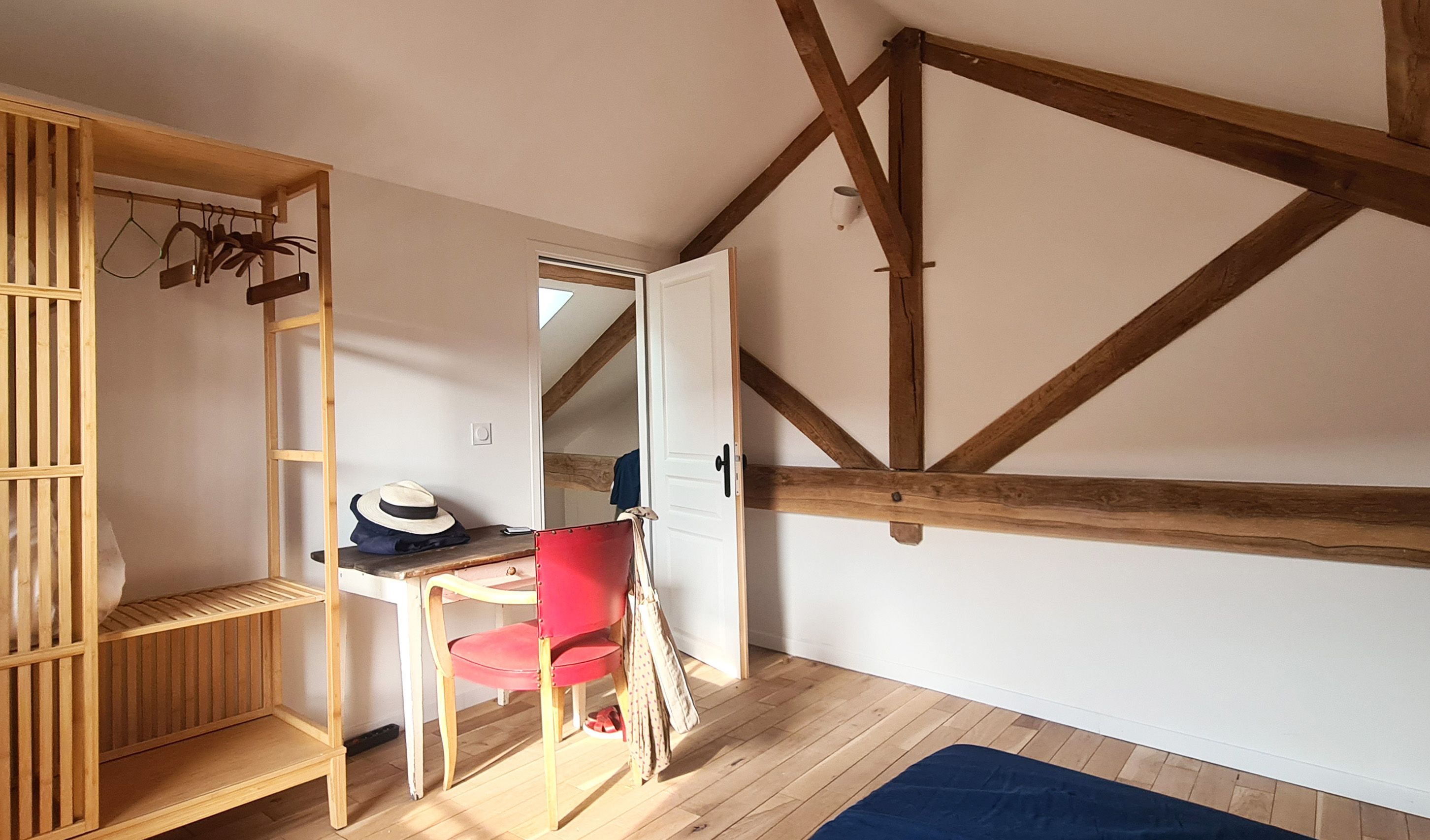 Le gîte s’organise sur deux niveaux dans une petite dépendance de la ferme. Il totalise une surface de 64 m².