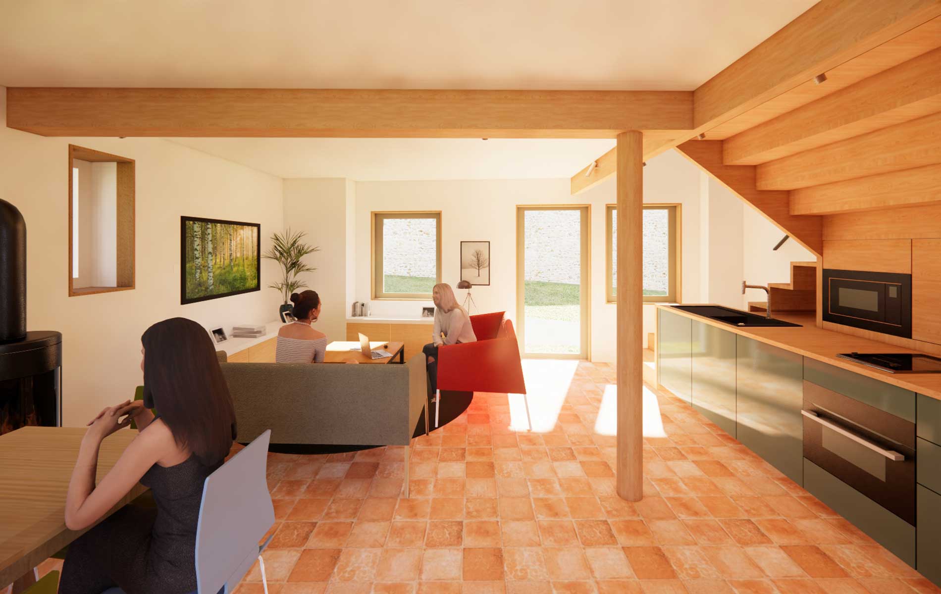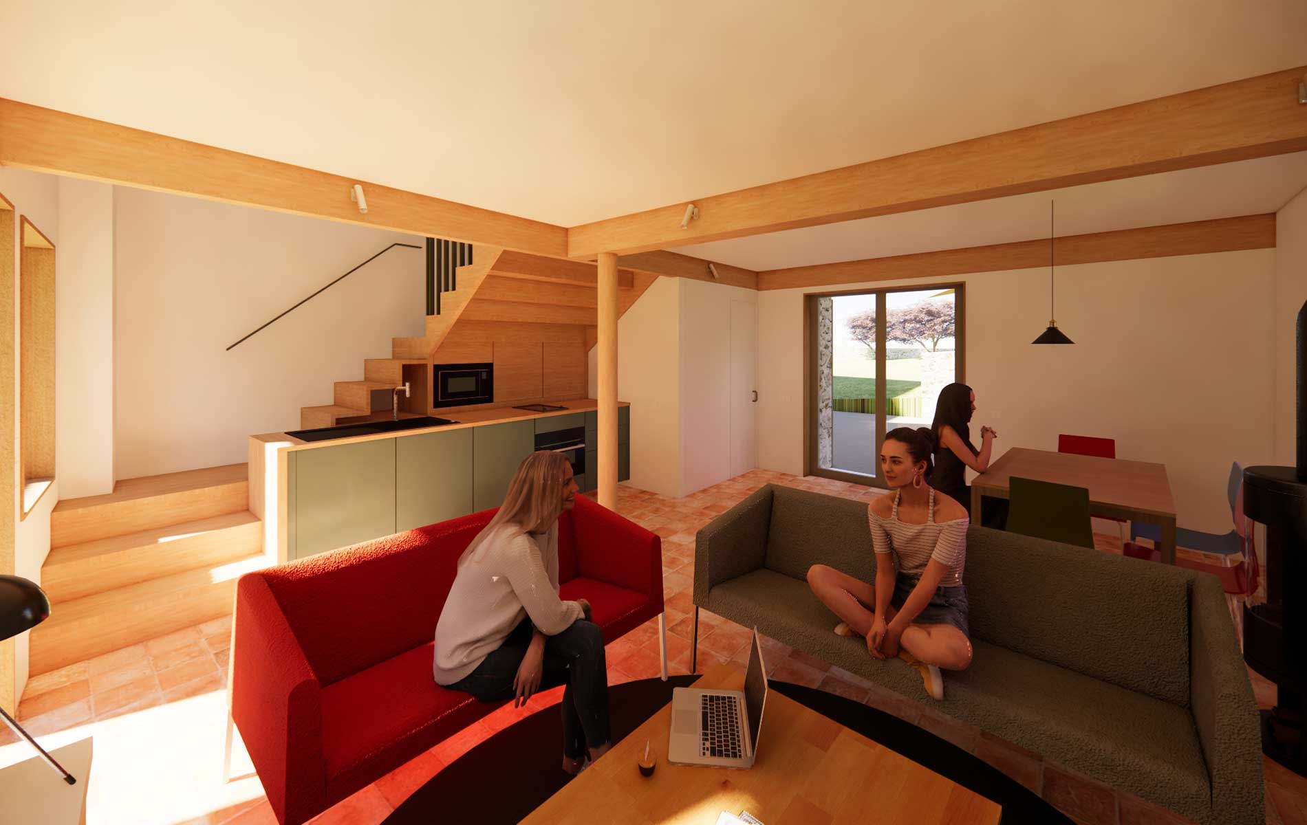 La majeure partie des travaux est réalisée en auto-construction par les propriétaires en favorisant autant que possible le réemploi.