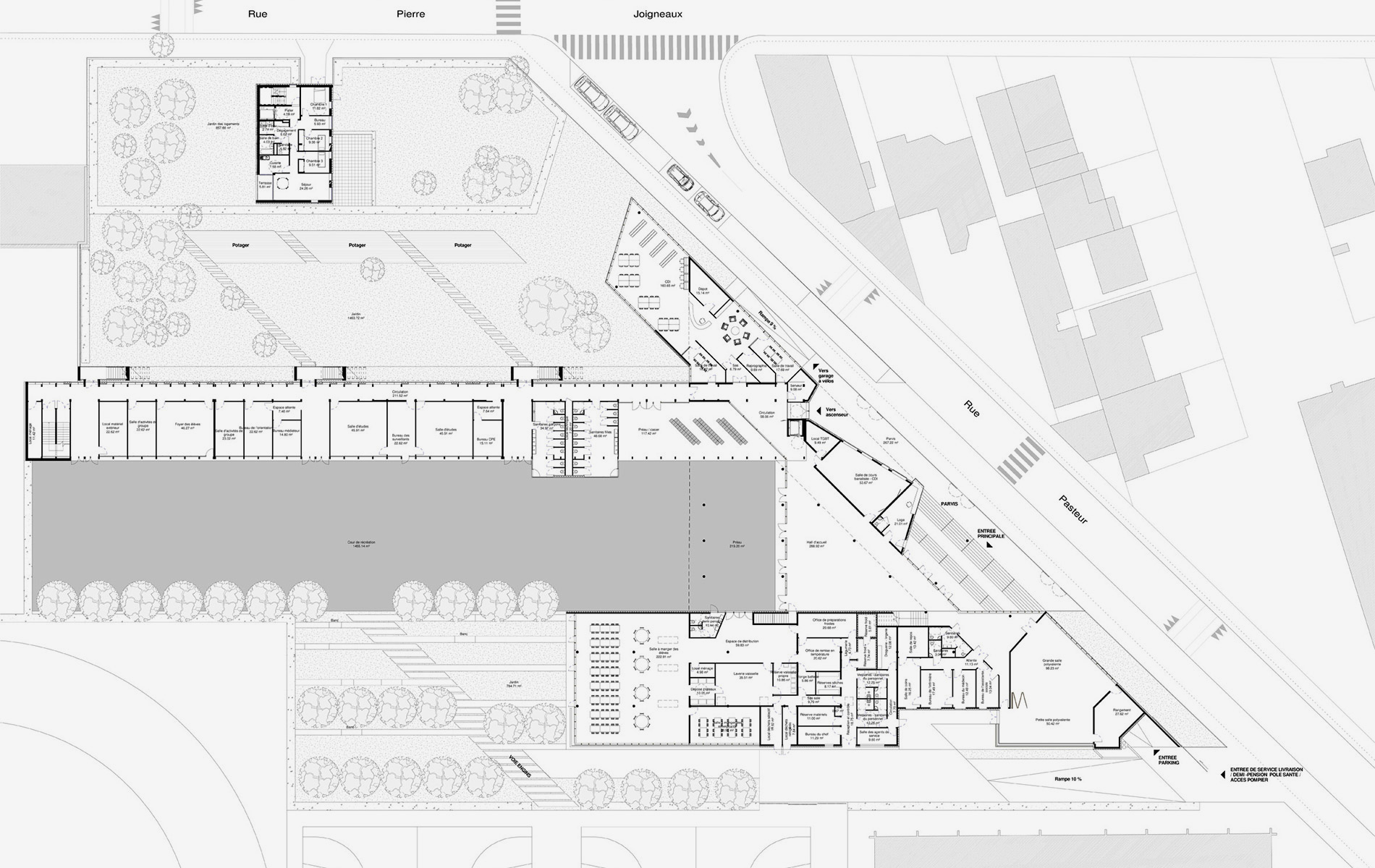 Notre approche de la rénovation architecturale du collège se joue en premier lieu à l’échelle urbaine, dans un rapport retrouvé avec la rue Pasteur, lieu de la future entrée. Au sud de la parcelle, les aménagements récents de la ZAC des Bruyères ont permis la rénovation des espaces publics selon cette même logique. De plus, la rue Pasteur étant pressentie comme nouveau vecteur de rénovation urbaine, notre proposition se tourne vers une volonté d’appuyer la façade principale du projet sur celle-ci. Le gabarit bas et allongé de la nouvelle construction est à l’échelle de la rue et des bâtiments qui la bordent. Jouant ainsi avec les deux directions de la rue Pasteur et du bâtiment existant, la partie en extension du projet s’inscrit en triangle dans le site. Cette forme géométrique simple permet une réintégration de la barre, dans son environnement urbain immédiat et participe pleinement à sa ré-habilitation dans son contexte. Cette figure du triangle, à la fois centrée et orientée, résout habillement l’articulation non seulement des éléments du site mais aussi du programme. Le gabarit existant du collège scinde la parcelle en deux entités distinctes : la cour de récréation au sud, minérale et animée, et le « jardin » au nord, calme et préservé. Le « triangle », par sa position stratégique, permet de retrouver un dialogue avec ces deux espaces singuliers. Il organise par ailleurs un espace fonctionnel au sud de la parcelle directement accessible depuis la rue Pasteur, l’aire de livraison. Les lignes recherchées sont épurées afin de répondre aux enjeux de compacité et dégager une forme élégante, unitaire et élancée.