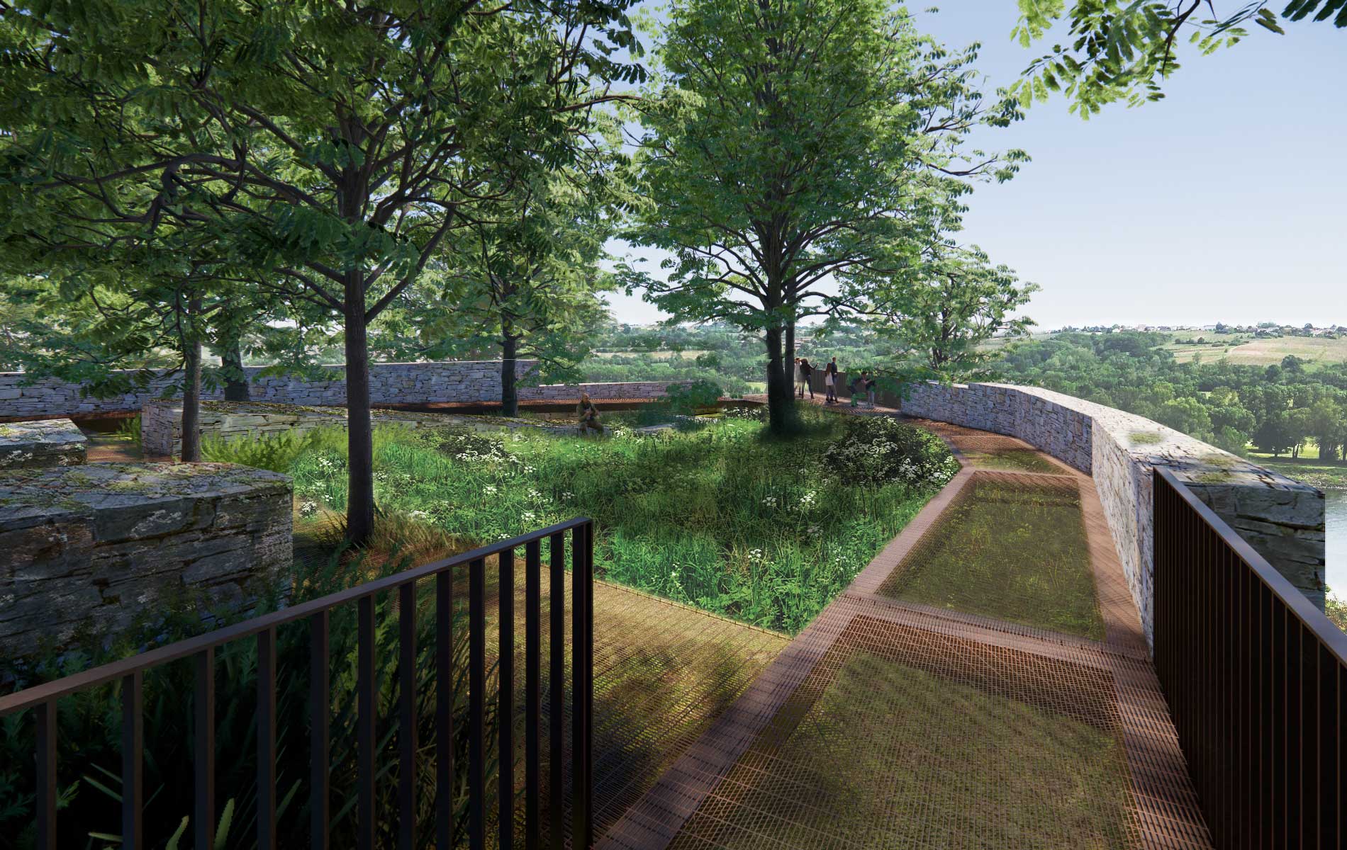 Après la phase diagnostics complétée des études topographiques, géotechniques, d’accessibilité PMR, paysagères et environnementales, une passerelle d’accès, utilisant les dénivelés du terrain pour réduire sa portée, permet l’accès à tous les publics depuis l’entrée principale du site jusqu’à la motte castrale : le traitement minéral du chemin existant, la passerelle en acier et caillebotis corten ainsi que le cheminement en pourtour de la motte castrale permettent de rendre accessible au public ce belvédère unique sur la Loire, d’offrir des vues sur les Folies Siffait tout en minimisant l’impact environnemental des nouveaux aménagements. Sur les murs maçonnés une signalétique est proposée pour donner des informations tant sur l’horizon et le grand paysage de la vallée de la Loire, sur les Folies Siffait, le relief et la végétation alentour, que sur les reliefs du Castel Guy médiéval disparu.
